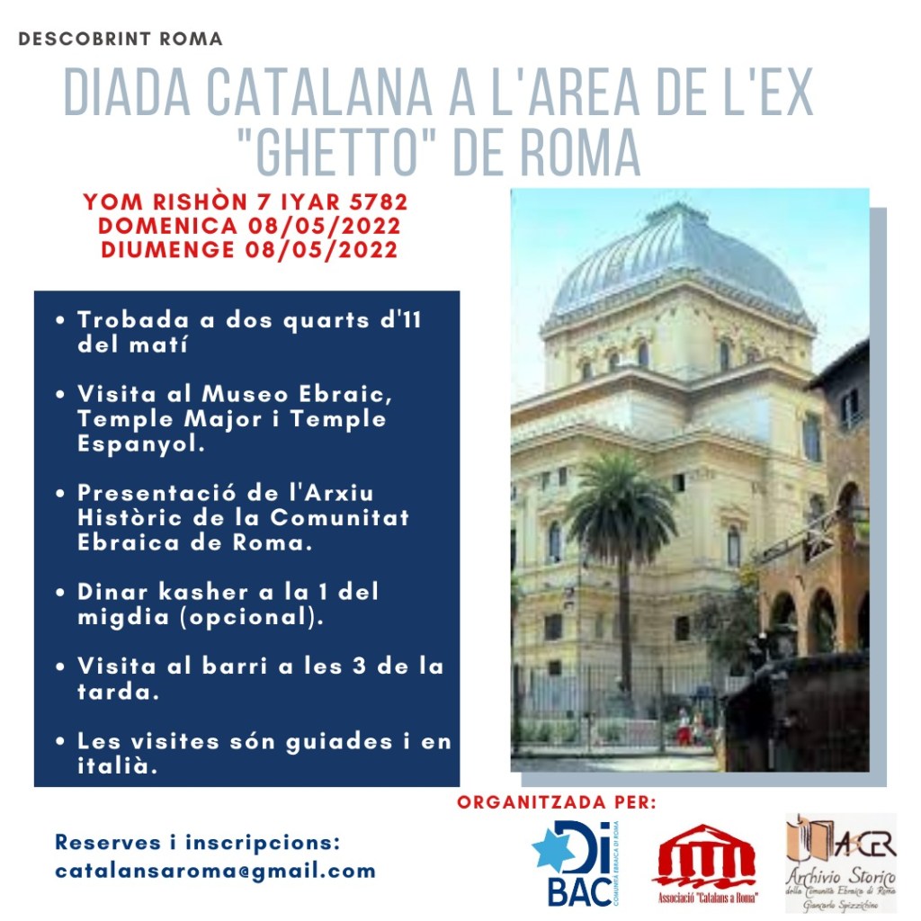 El proper diumenge 8 de maig, farem una sortida a l’àrea de l’ex-ghetto de Roma, amb la particularitat que seguirem les petjades que hi han deixat els catalans a través dels segles.